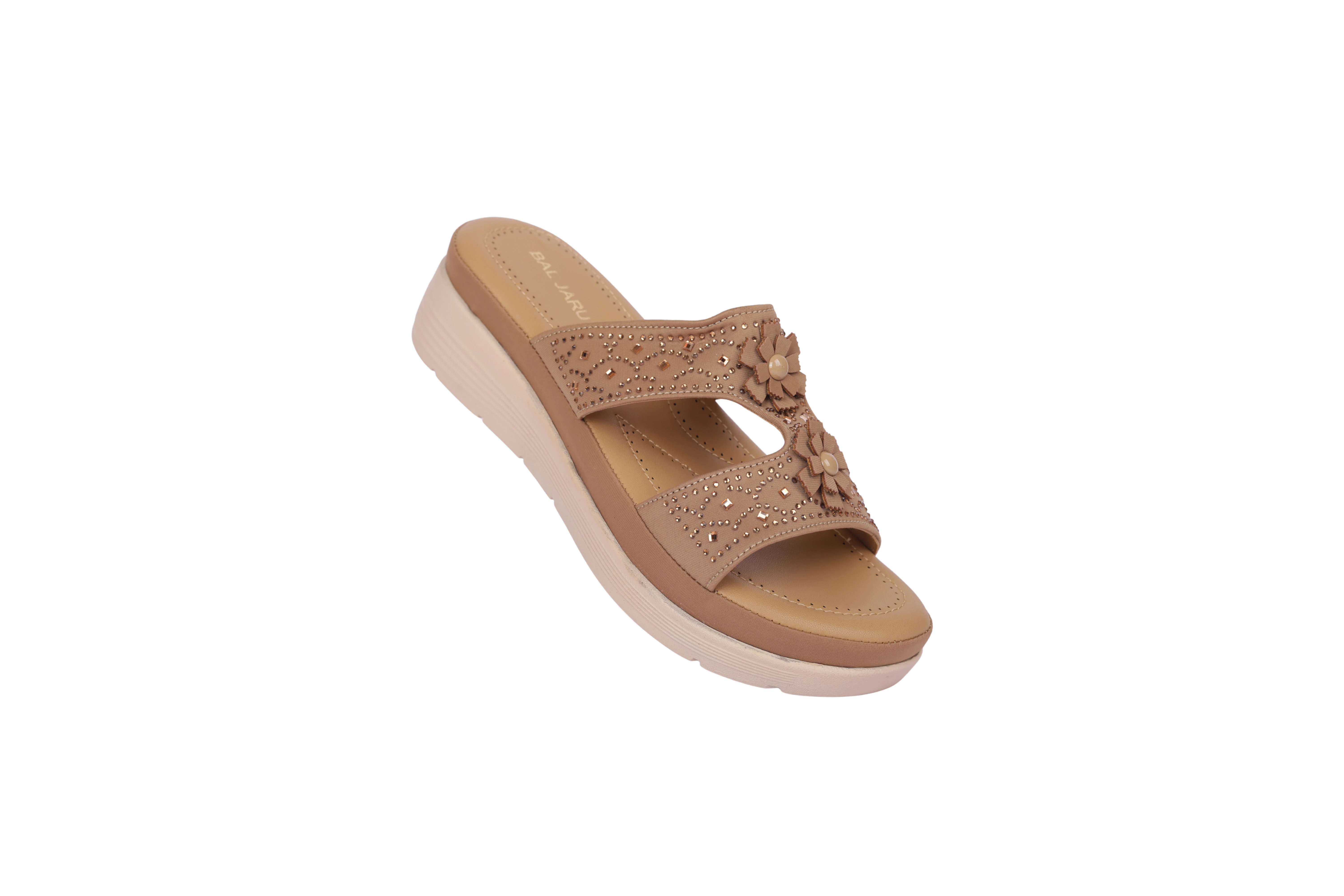 Discover the perfect blend of comfort and style with the Baljaru Floral Embellished Platform Sandals, available in elegant Tan and Beige shades. These lightweight slip-on sandals are designed for women who appreciate fashion with functionality.