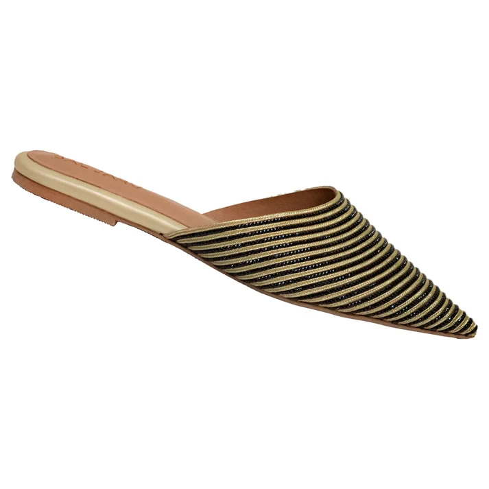 These mules offer a stylish, luxurious look with a pointed toe and gold stone sheet finish. The cushioned footbed provides all-day comfort and the slip-on design adds practicality